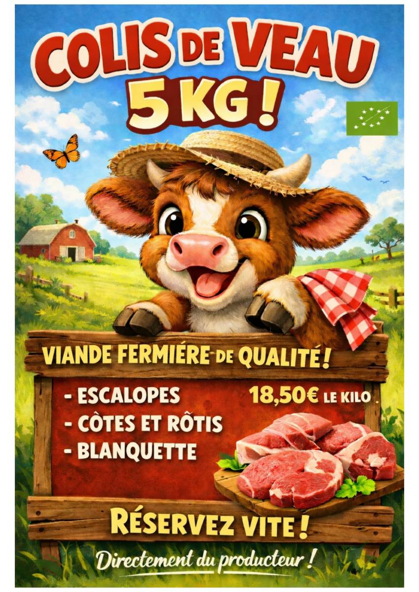 < colis de veau de 5 kg morceaux panachés sous vide par 2 pièces à 17€50 du kg.