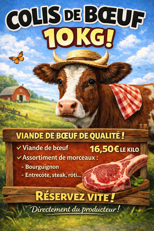 colis de boeuf croisé Angus de 10kg morceaux panachés sous vide par 2 pièces à 15€50 du kg.